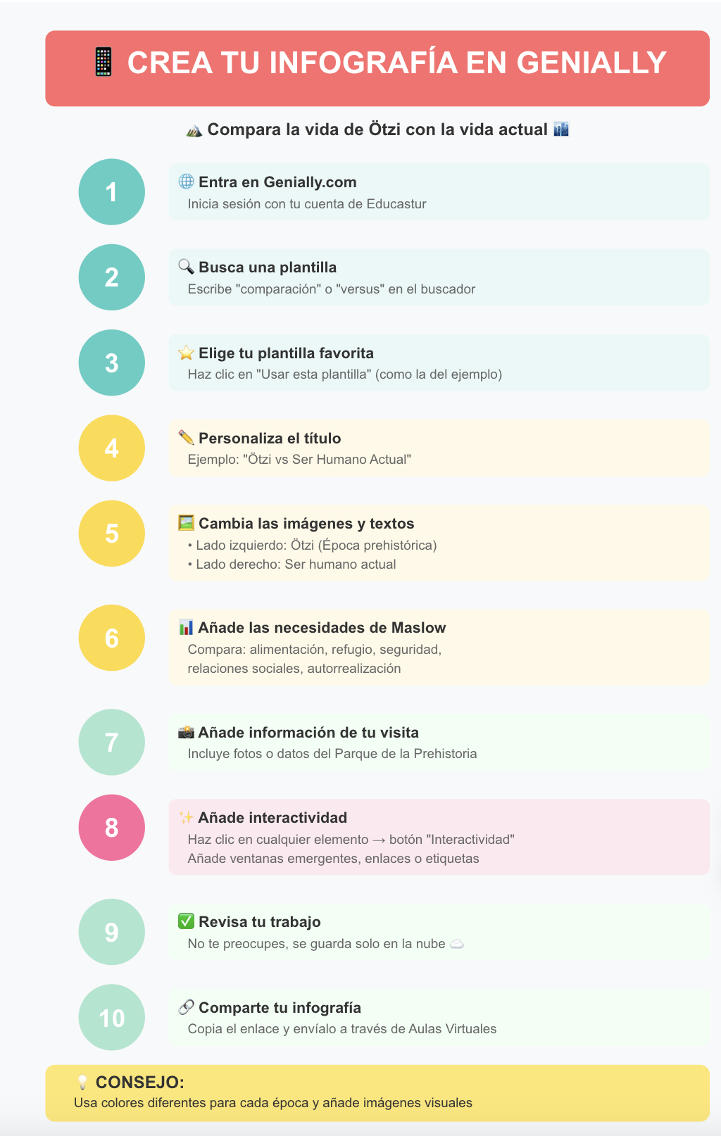 Después de conocer a Ötzi en Hablaconlahistoria.es y visitar el Parque de la Prehistoria de Teverga, vais a crear una infografía digital comparando cómo vivía Ötzi con cómo vivimos hoy. Utilizaréis Genially, una herramienta visual y fácil.